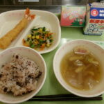 今日の給食は、6年生の卒業をお祝いする給食でした。すまし汁の中には、「祝」の文字入りのかまぼこが入っていました。お赤飯やエビフライなど、お祝いの気持ちがこもったメニューでした。