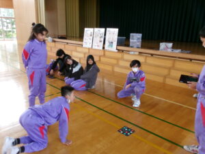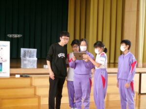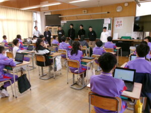 午後からは、「ライフプランセミナー」として、県立大学の先生や学生が来校し、ドローン教室を行いました。まず、教室で、大学の先生や大学生から話を聞き、子供たちからの質問にも答えていただきました。大学で学ぶことなんて、遠い未来のことで考えたこともなかったかもしれませんが、今回のお話をきっかけに自分の将来を考えることができたのではないでしょうか。教室で話を聞いた後は、体育館に移動し、ドローン教室を行いました。実際にドローンをリモコンで操作し、障害物を避けながら、ゴールまでドローンを動かしました。初めは操作に戸惑っていたようですが、次第に慣れていき、みんな上手にドローンを飛ばすことができました。