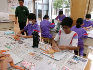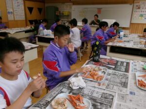 今日、6年生は「カニ給食」の日でした。射水市の小学6年生を対象に毎年実施されているものです。子供たちは家庭科室に入り、担任の先生からカニを一人ずつ受け取りました。初めてカニを剥いて食べるという子供もおり、とてもにぎやかでした。「どうやって食べればいいの?」「なかなかうまくできないよー」「見て、うまく身を出せたよ!」「すごくおいしい!」と、みんなでカニをいただきました。カニを食べた後は、通常の給食でしたが、みんなモリモリ給食も食べることができました。