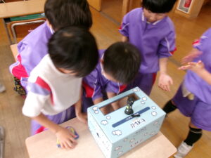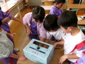 手に汚れに見立てたハンドクリームを塗り、各自で手洗いをした後、特殊な光に当てて手に残っている汚れを確認しました。しっかり手洗いしたつもりでも、爪の周りや、手の甲、手首などに汚れが残っていることが分かりました。1年生は、手洗いの歌を歌いながら、きちんと手の汚れを落とす洗い方を学びました。