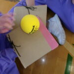 まだテニピンを始めたばかりの今は、まず、ダンボールのラケットに慣れ、ボールをうまく打ったり受けたりするといった一人一人の技術を高めるための練習をしています。一人一人がラケットやボールのうまい扱い方に慣れるとともに、どんなことに気を付ければうまくラリーを続けることができるかをみんなで探っています。