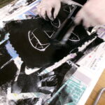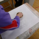 今日は、版画の仕上げの時間となり、自分がつくったオニの版にインクをつけて、紙に写し取りました。子供たちは、担任の先生が自分のつくった版にインクをつけてくれるのをそばでじっと見つめながら待ち、インクのついた版の上に大きな白い紙を置いてバレンや指でこすり、丁寧に刷り取りました。最後にそっと紙を剥がしたら、迫力のあるオニの版画の完成です。みんなができあがった自分の作品を見て、とても満足そうな表情でした。