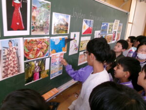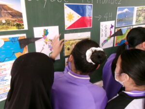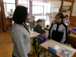 1回目は、ALTの先生の出身地であるフィリピンについて、英語で説明を聞きました。子供たちは、聞き取れた単語を手がかりに内容を予想しながら、一生懸命話を聞いていました。最後には、ALTの先生に自己紹介をしました。習った表現を使って自分のことを伝えようとする姿から、外国語の授業を楽しもうとする気持ちが伝わってきました。