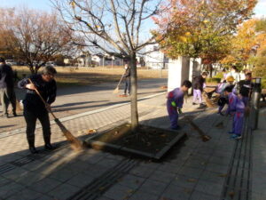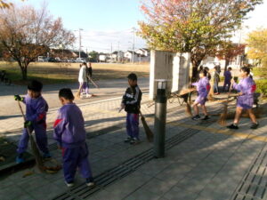 今日は「チームほりおか」地域のボランティアの方5名が学校に来られて、子供たちと一緒に落ち葉掃きをしてくださいました。たくさんの子供たちが、熊手や竹ほうきをもって落ち葉掃きをしてくれました。