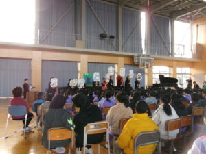 会では、2年生が歌を披露したり、1年生がつくったメダルを渡したりしました。また、全校で「ありがとうのはな」を合唱しました。