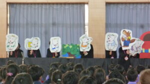 「なでしこの会」の皆さんが、ペープサートで「おおかみと7匹の子やぎ」を披露してくださいました。途中、オオカミを退治したり、一緒に「手のひらを太陽に」を歌ったりして、子供たちも参加することができ、とても楽しい読み聞かせの時間となりました。