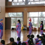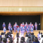 まず6年生が、鼓笛隊の衣装を身に付け、隊列を組んで体育館に入場し、校歌を演奏しました。その後、6年生から5年生へ、「みんなの心を一つにして鼓笛演奏をがんばってほしい」というメッセージとともに、指揮杖と楽器が引き継がれました。また、新たに鼓笛隊に加わる3年生に対しても鼓笛隊でがんばってほしいというメッセージが6年生から送られました。3年生は全員で、6年生からの応援のメッセージに対して「がんばります」と元気に返事をしていました。