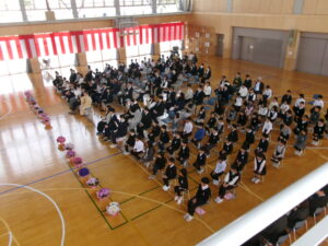 新1年生は、担任の先生方とともに、元気に体育館に入場しました。また、式の最中は、姿勢を正してお話を聞いたり、名前を呼ばれて大きな声で返事をしたりするなど、大変立派でした。